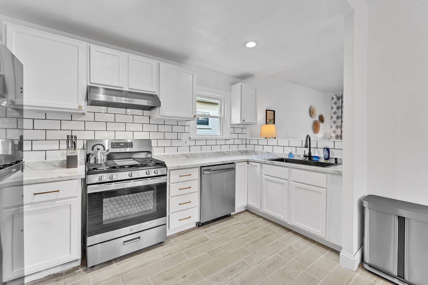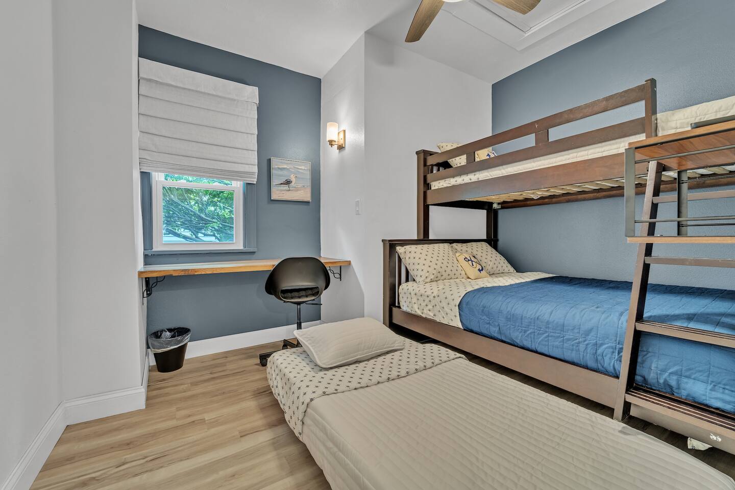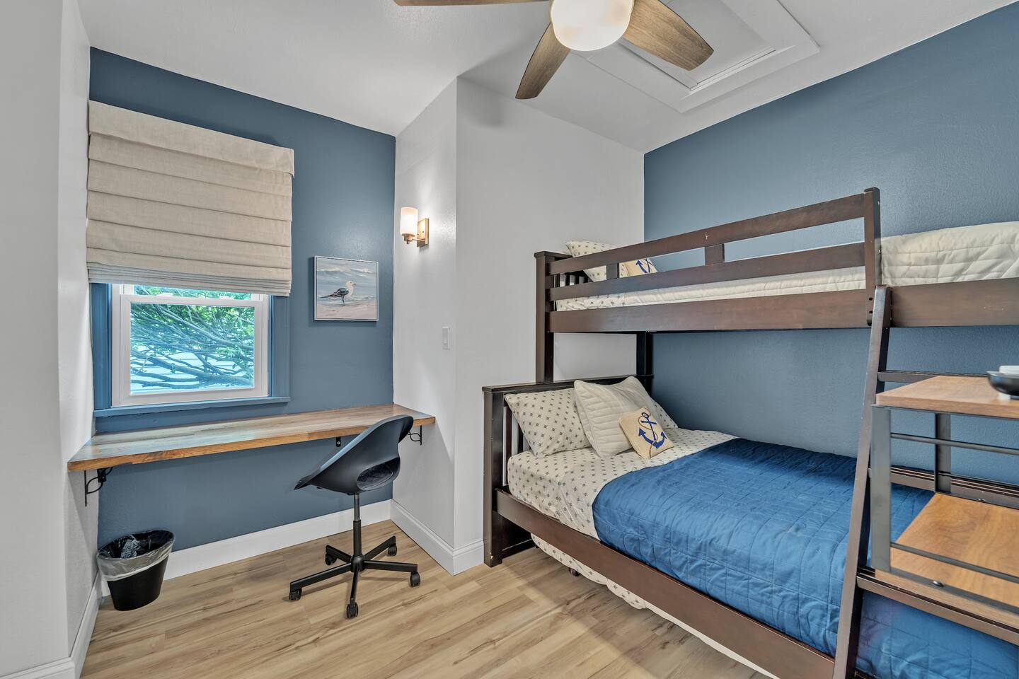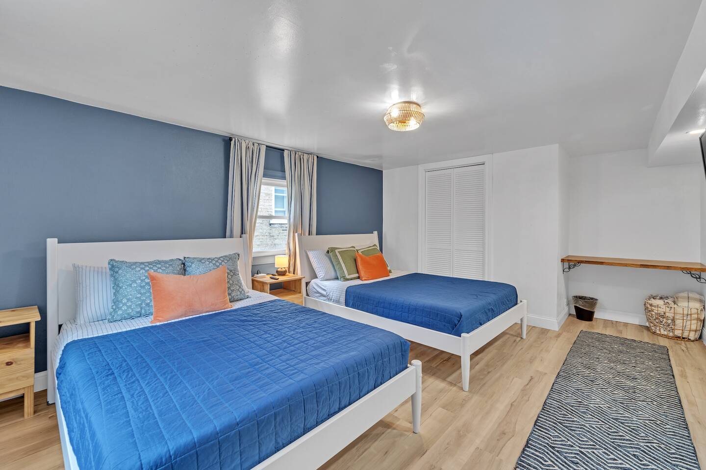 We finished an extensive full renovation in summer 2024, topped off by adding all brand new everything: furnishings, window treatments, linens, kitchen items, appliances… virtually every single item in the house is new! Up to 12 people can sleep quite comfortably, enjoying a master king bedroom, a queen bedroom, one double queen bedroom, and a 4th bedroom with a single-over-double bunk plus single pull-out trundle bed. All bedrooms except the bunk bed room include a closet or dresser drawers for your items.
