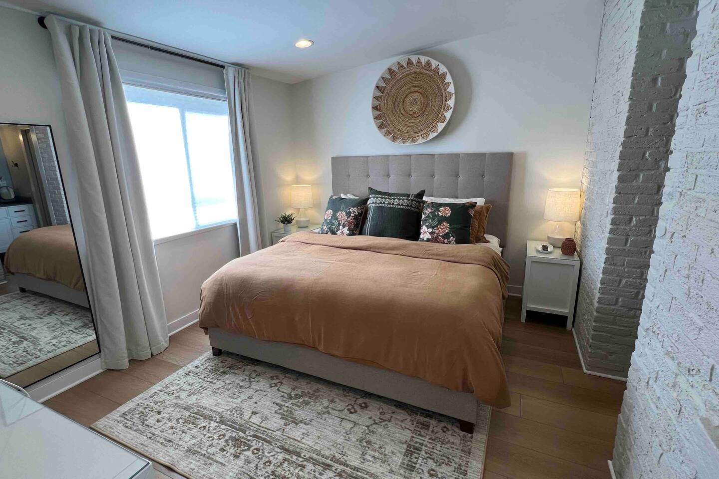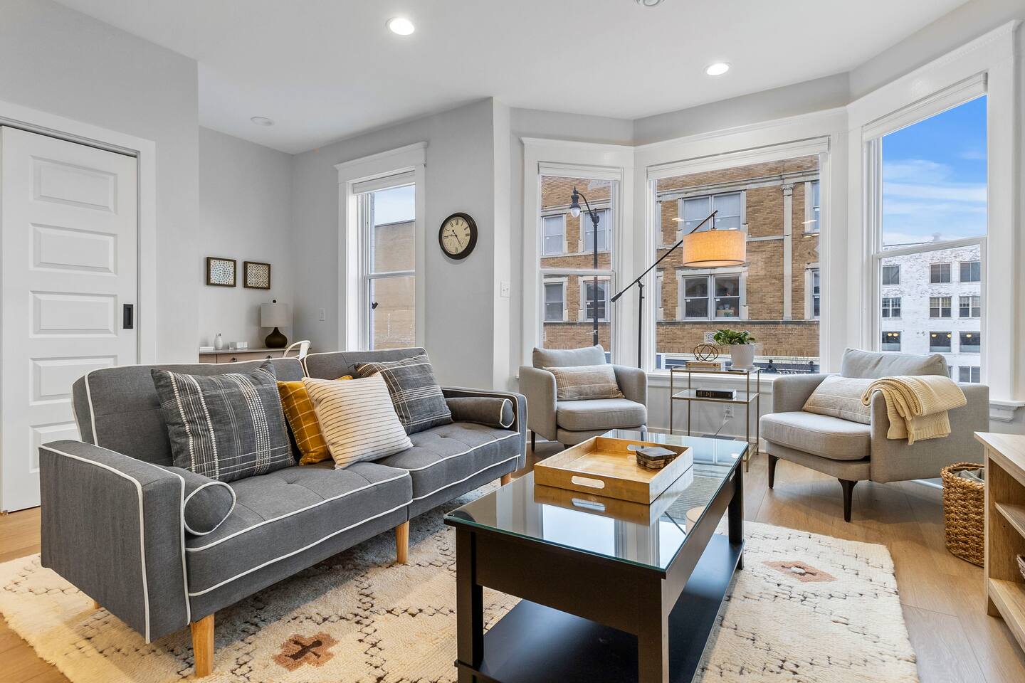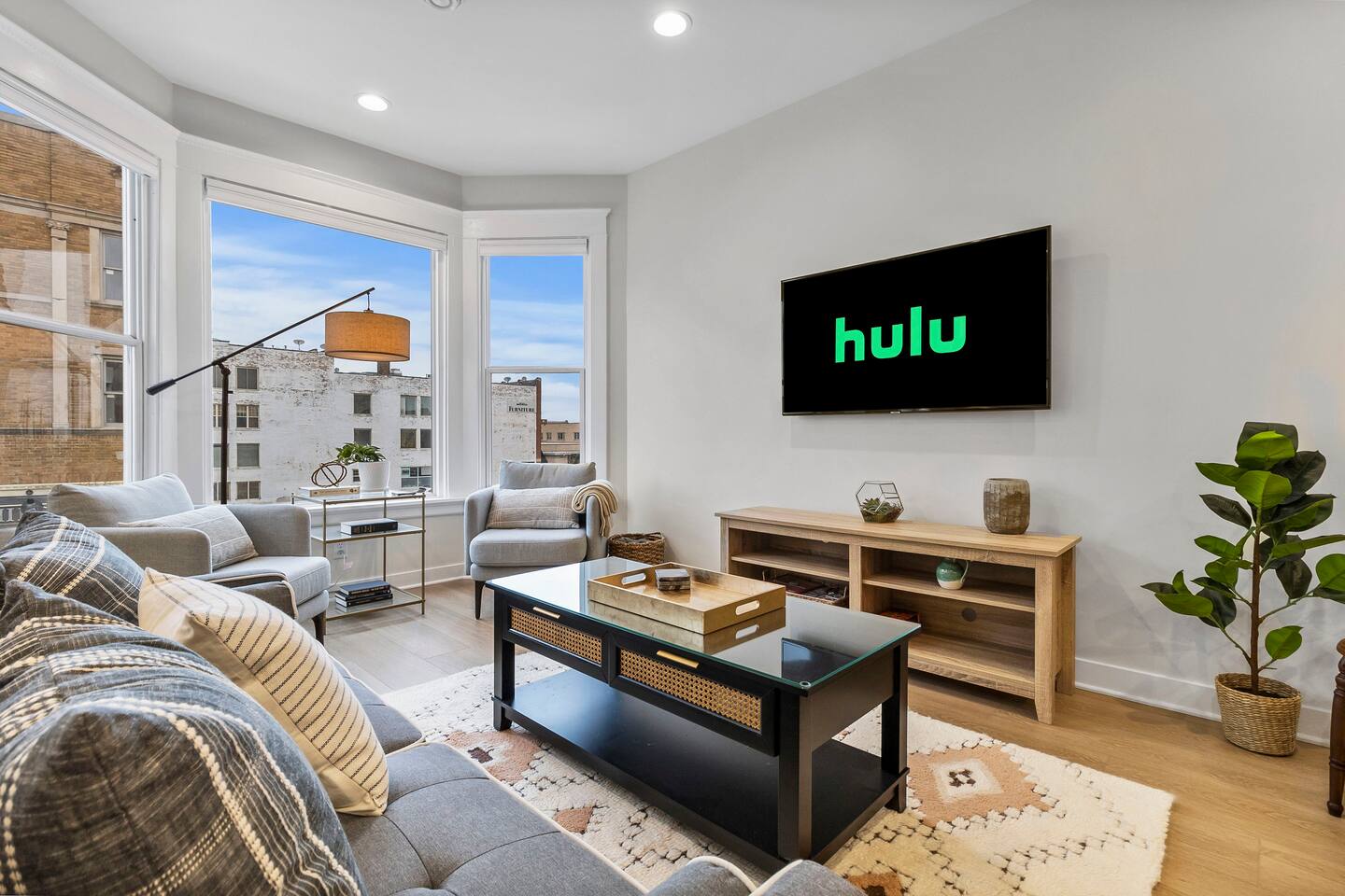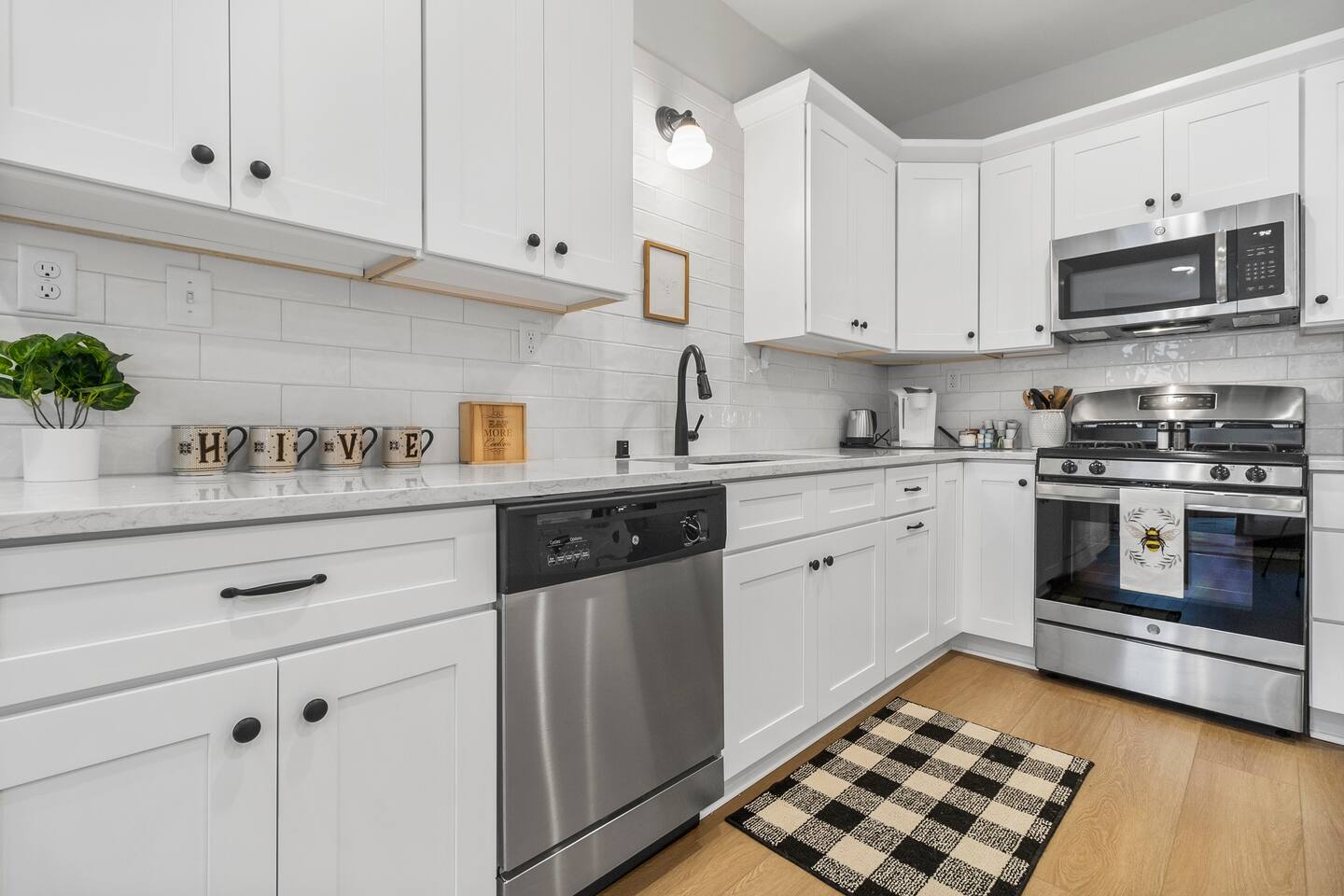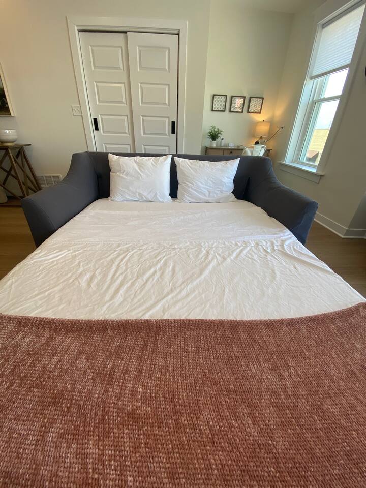 "Welcome to Sunrise View 2BR, 2BA Hive apartment in downtown Racine. This freshly refurbished space accommodates 6 guests with 2 bedrooms (King with attached bath and Queen) an open living area, with a queen sofa sleeper, desk and a fully-equipped kitchen with island seating. Enjoy serene lake views and stunning sunrises from the bay window. Walk to nearby restaurants and enjoy free off-street parking."