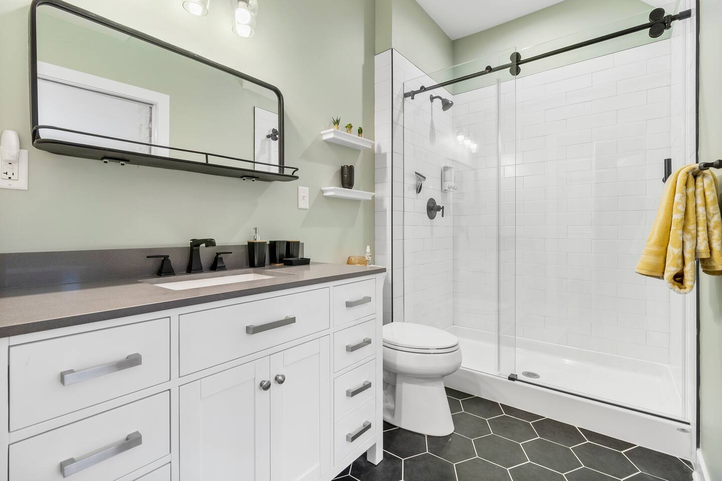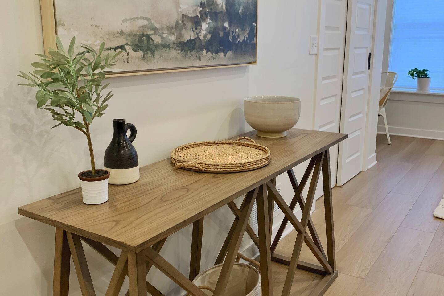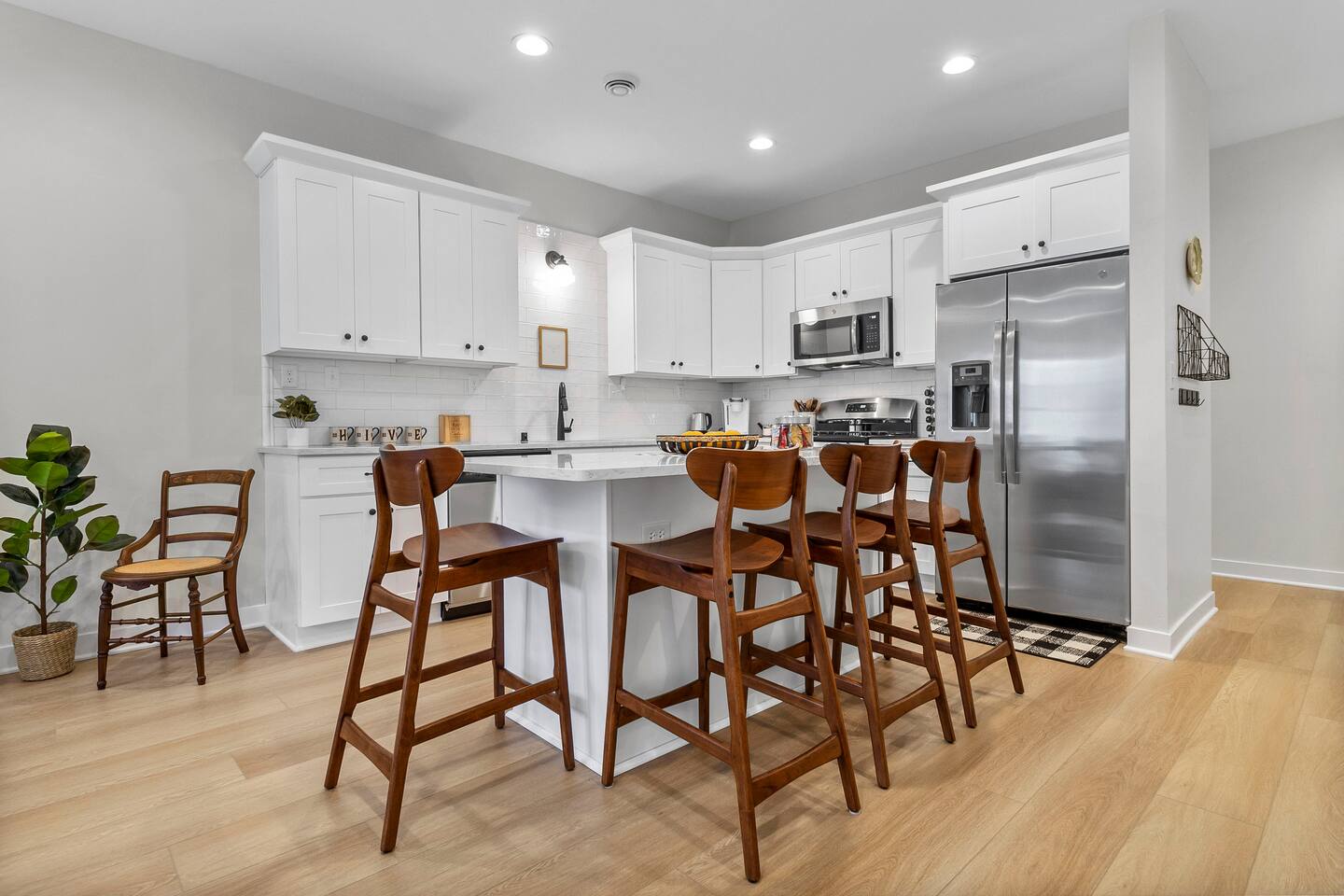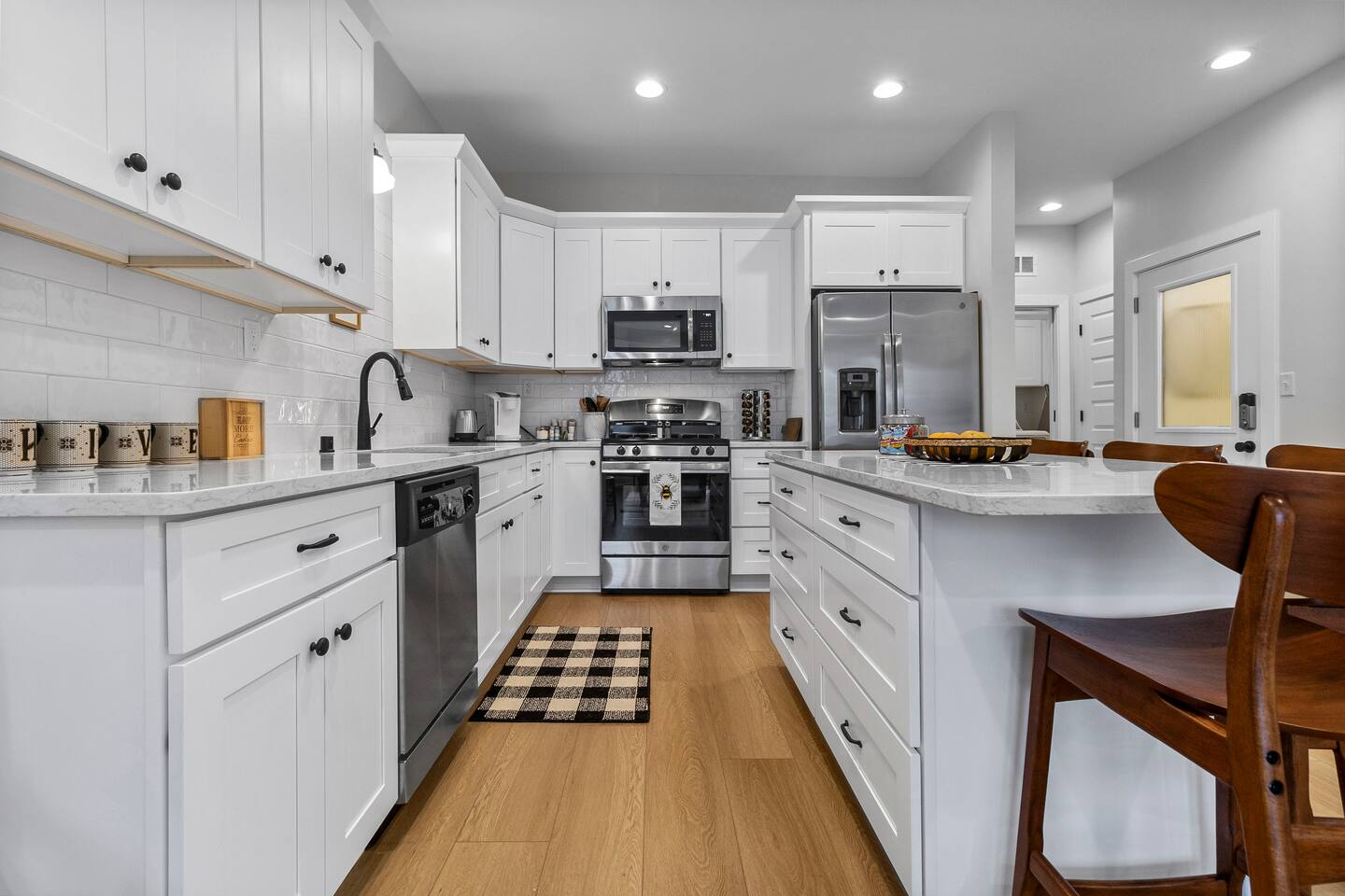 The Sunrise View apartment, situated upstairs in the historic 413 1/2 6th Street building, exudes privacy and comfort. Lightly styled with a modern flair and subtle bee-themed touches, this space offers an open-concept living area, two spacious bedrooms, two bathrooms, and a fully-equipped kitchen with island seating. Smart TV's are provided and you can stream from your own accounts.