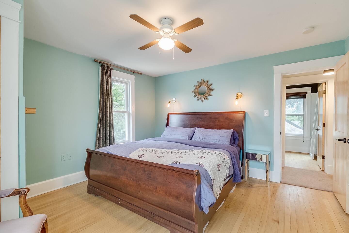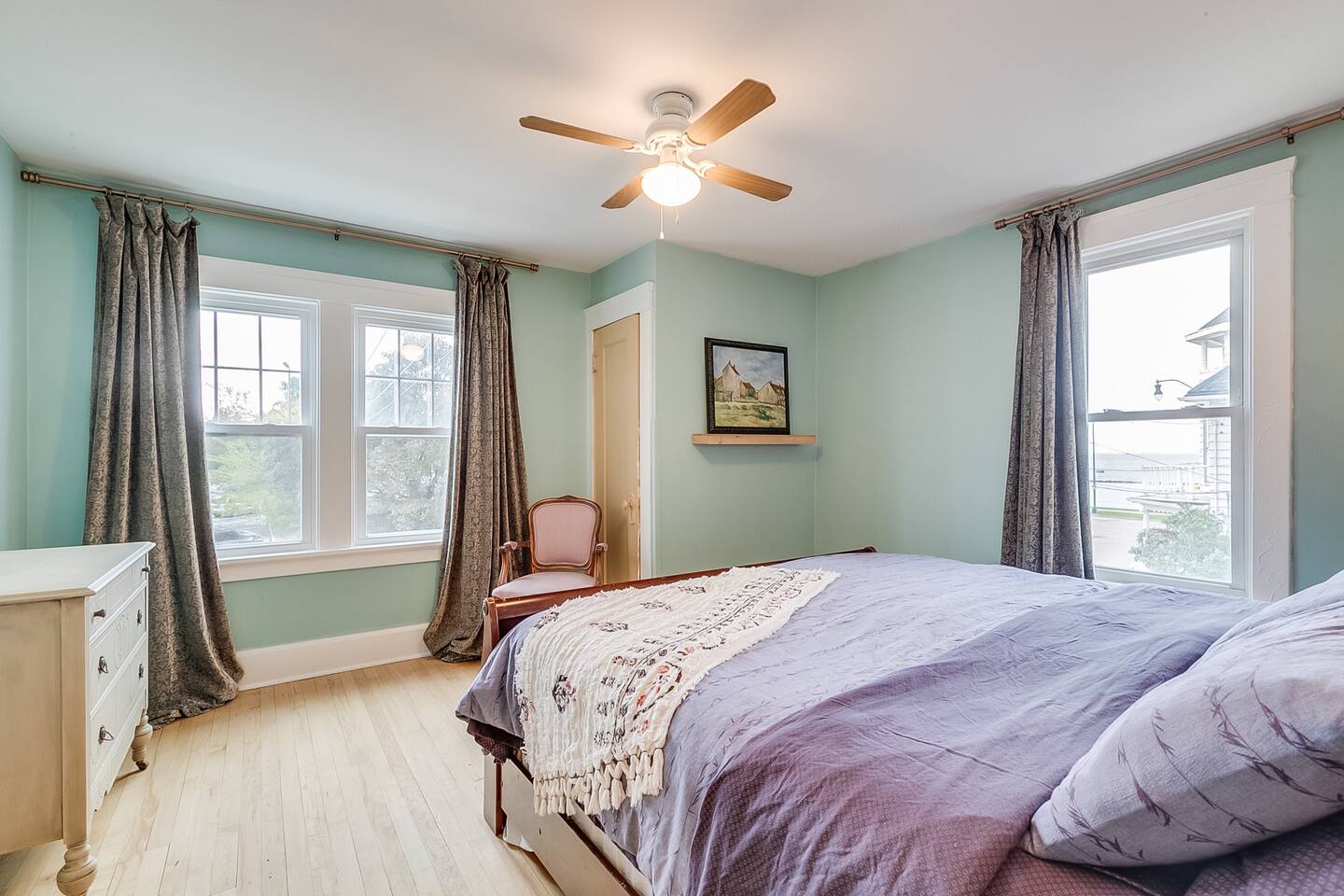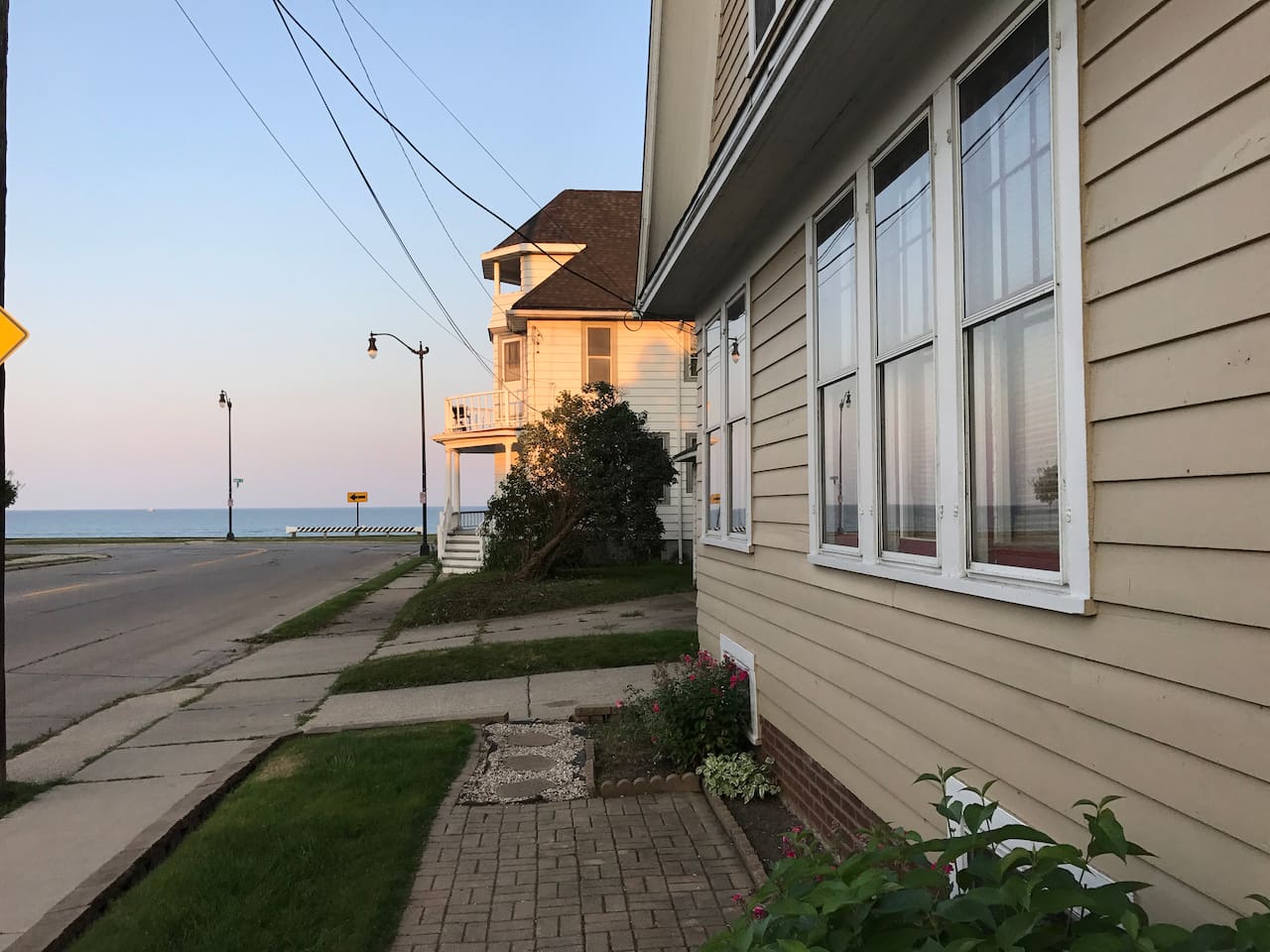 The house sits just before Main Street which is full of historic homes and lakefront views and leads to paved walking paths along the lake. There are parks in walking distance. The house is near a busy corner. We get very little negative feedback about this but have had a guest or two who maybe wished they had earplugs at night to help with the sound of cars passing. We do have box fans for each room if that helps.