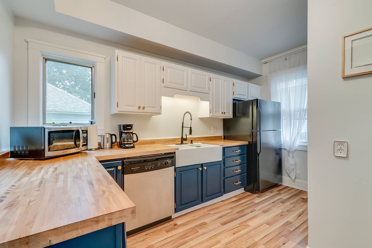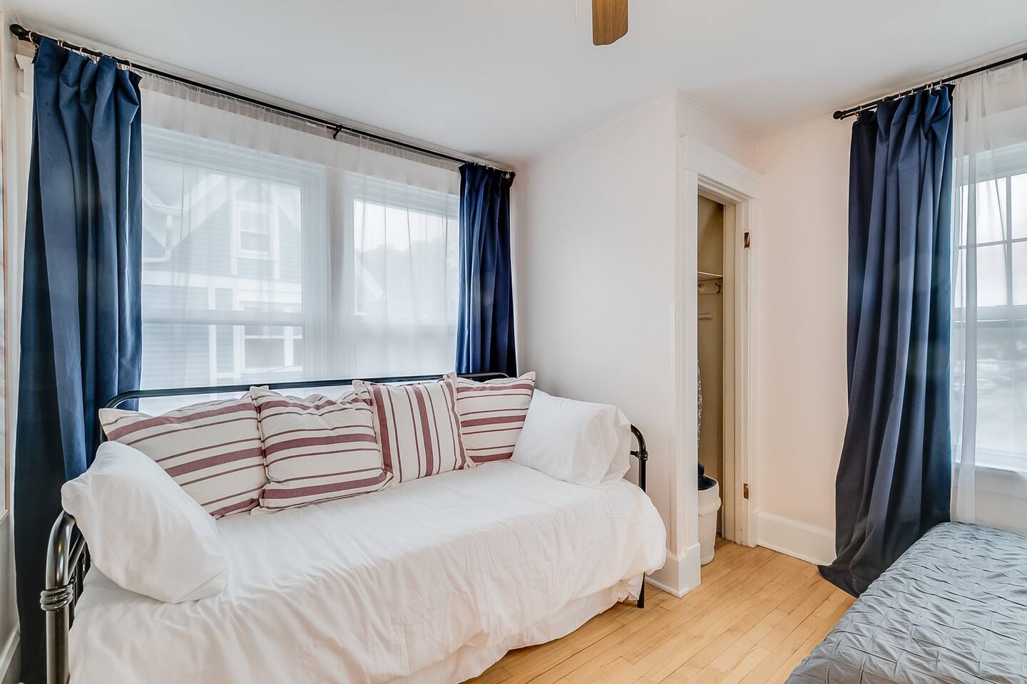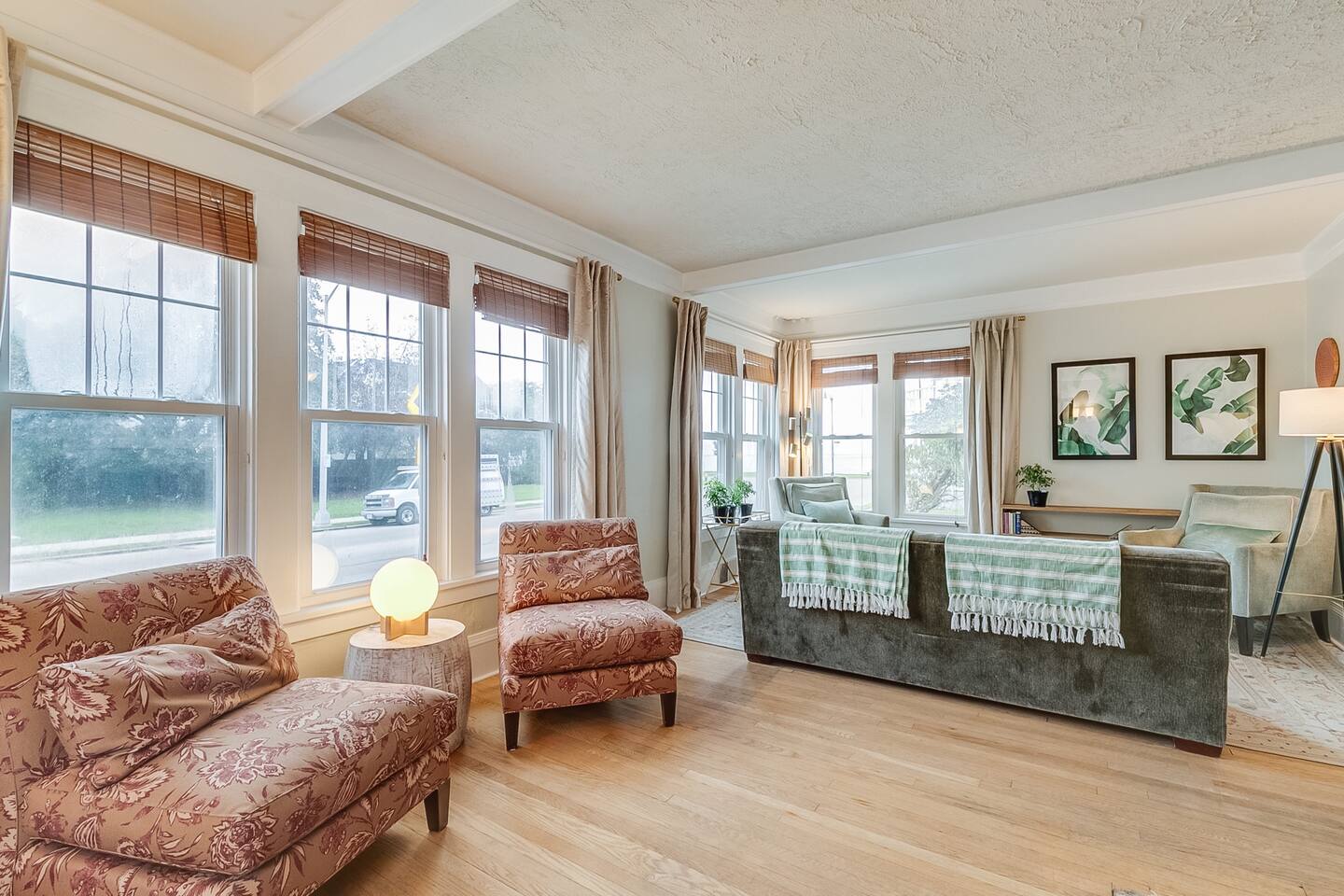 The house sits just before Main Street which is full of historic homes and lakefront views and leads to paved walking paths along the lake. There are parks in walking distance. The house is near a busy corner. We get very little negative feedback about this but have had a guest or two who maybe wished they had earplugs at night to help with the sound of cars passing. We do have box fans for each room if that helps.